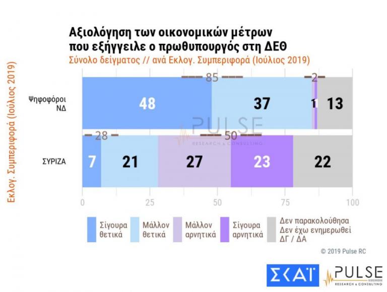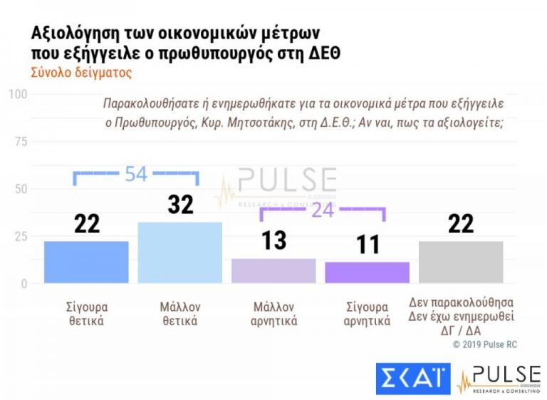 Αξιολογώντας τα οικονομικά μέτρα που εξήγγειλε ο Κ. Μητσοτάκης στη ΔΕΘ, το 54% λέει ότι είναι θετικά (32%) ή σίγουρα θετικά (22%). Το 24% λέει μάλλον αρνητικά ή σίγουρα αρνητικά. Στους ψηφοφόρους της ΝΔ θετικά κρίνει το 85% ενώ στους ψηφοφόρους του ΣΥΡΙΖΑ υπάρχει ένα 28% (δηλαδή σχεδόν 3 στους 10) που κρίνουν θετικά τα οικονομικά μέτρα.