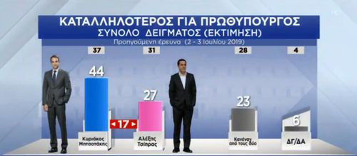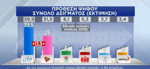 Δημοσκόπηση της Pulse που παρουσιάστηκε στο κεντρικό δελτίο ειδήσεων του ΣΚΑΪ δείχνει την διαφορά μεταξύ ΝΔ-ΣΥΡΙΖΑ, σχεδόν 2,5 μήνες μετά τις εκλογές, να έχει εκτιναχτεί στις 13,4 μονάδες.