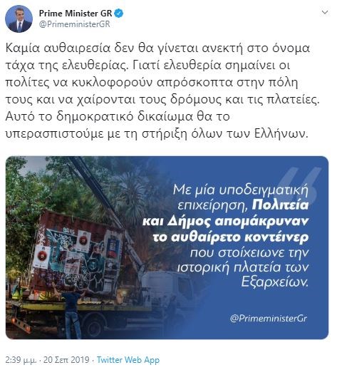 Με ανάρτηση στο twitter σχολίασε ο Πρωθυπουργός, Κυριάκος Μητσοτάκης την επιχείρηση που έγινε λίγο μετά τις 6 τα ξημερώματα στην Πλατεία Εξαρχείων προκειμένου να απομακρυνθεί το κοντέινερ που είχε τοποθετήσει ο «Ρουβίκωνας».