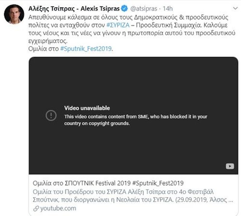 Το βίντεο είναι, πλέον, διαθέσιμο στην προσωπική σελίδα του Αλέξη Τσίπρα καθώς, προφανώς, οι ιθύνοντες προέβησαν αργότερα στις απαραίτητες ενέργειες