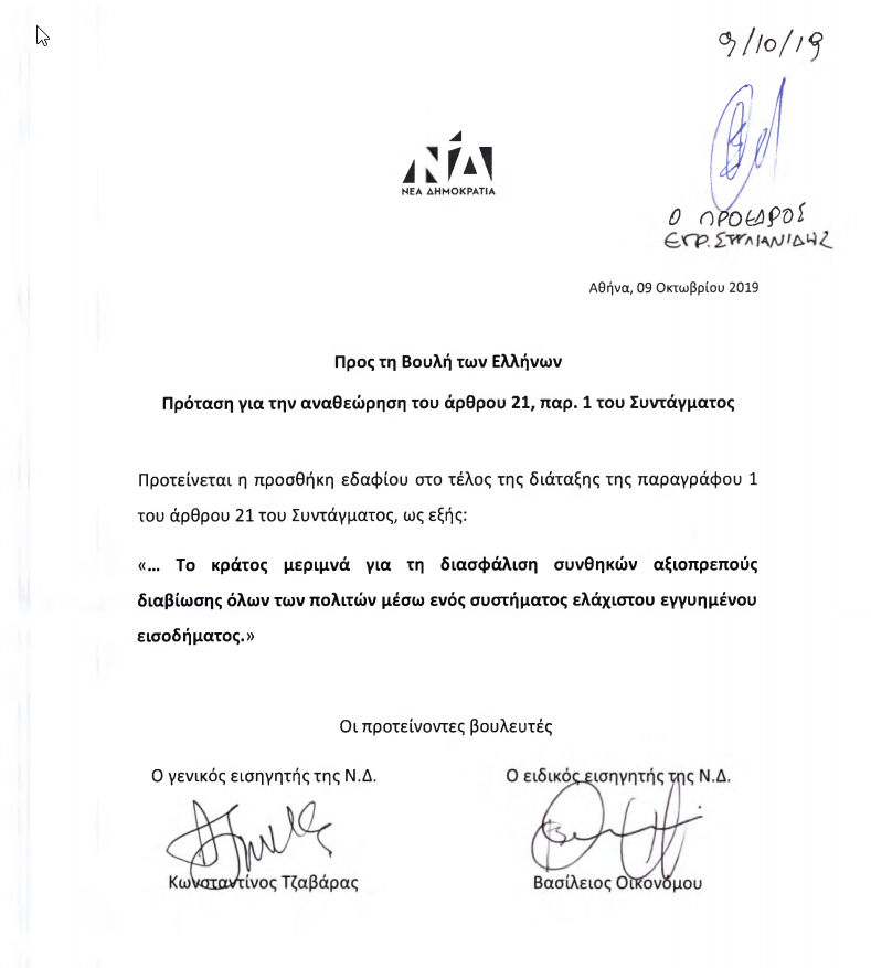 Η πρόταση της ΝΔ προβλέπει την προσθήκη στο επίμαχο άρθρο 21, παρ. 1 του Συντάγματος αναφορά ότι «το κράτος μεριμνά για τη διασφάλιση συνθηκών αξιοπρεπούς διαβίωσης όλων των πολιτών μέσω ενός συστήματος ελάχιστου εγγυημένου εισοδήματος».