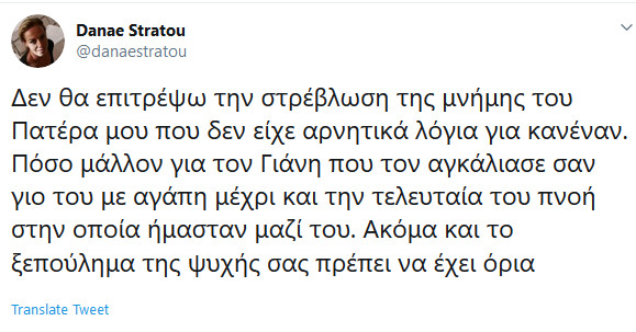 «Δεν θα επιτρέψω την στρέβλωση της μνήμης του Πατέρα μου που δεν είχε αρνητικά λόγια για κανέναν. Πόσο μάλλον για τον Γιάνη που τον αγκάλιασε σαν γιο του με αγάπη μέχρι και την τελευταία του πνοή στην οποία ήμασταν μαζί του. Ακόμα και το ξεπούλημα της ψυχής σας πρέπει να έχει όρια», έγραψε στην ανάρτησή της η Δανάη Στράτου.