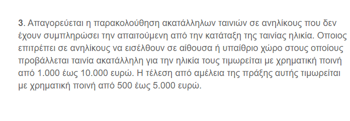 3. Απαγορεύεται η παρακολούθηση ακατάλληλων ταινιών σε ανηλίκους που δεν έχουν συμπληρώσει την απαιτούμενη από την κατάταξη της ταινίας ηλικία. Οποιος επιτρέπει σε ανηλίκους να εισέλθουν σε αίθουσα ή υπαίθριο χώρο στους οποίους προβάλλεται ταινία ακατάλληλη για την ηλικία τους τιμωρείται με χρηματική ποινή από 1.000 έως 10.000 ευρώ. Η τέλεση από αμέλεια της πράξης αυτής τιμωρείται με χρηματική ποινή από 500 έως 5.000 ευρώ.