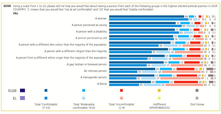 Μία από τις ερωτήσεις στις οποίες κλήθηκαν να απαντήσουν οι Ευρωπαίοι – και οι Έλληνες – ήταν πως θα αισθάνονταν εάν ένα μέλος διαφορετικών ομάδων αναλάμβανε το ανώτατο εκλεγόμενο πολιτικό αξίωμα της χώρας τους.
