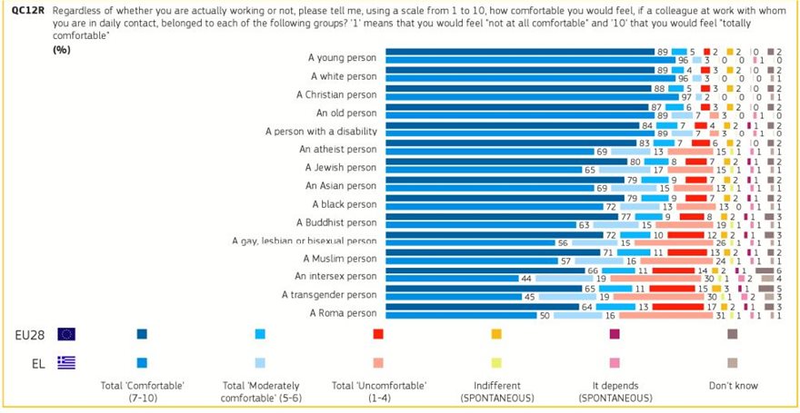 Σε ερώτηση αν θα αισθάνονταν πολύ άνετα με έναν συνάδελφο που θα ήταν μαύρος το 72% των Ελλήνων απαντά θετικά. Το 56% απαντά πως νιώθει πολύ άνετα με γκέι, λεσβίες και bisexual συναδέλφους και το 50% με Ρομά συναδέλφους. Το 45% δηλώνει πως θα αισθανόταν πολύ άνετα με transgender συναδέλφους ενώ το 30% των Ελλήνων απαντά ότι θα ένιωθε άβολα με intersex άτομα στη δουλειά του. Σχεδόν ένας στους πέντε (19%) θα ένιωθε άβολα και με βουδιστές συναδέλφους στον ίδιο χώρο εργασίας.