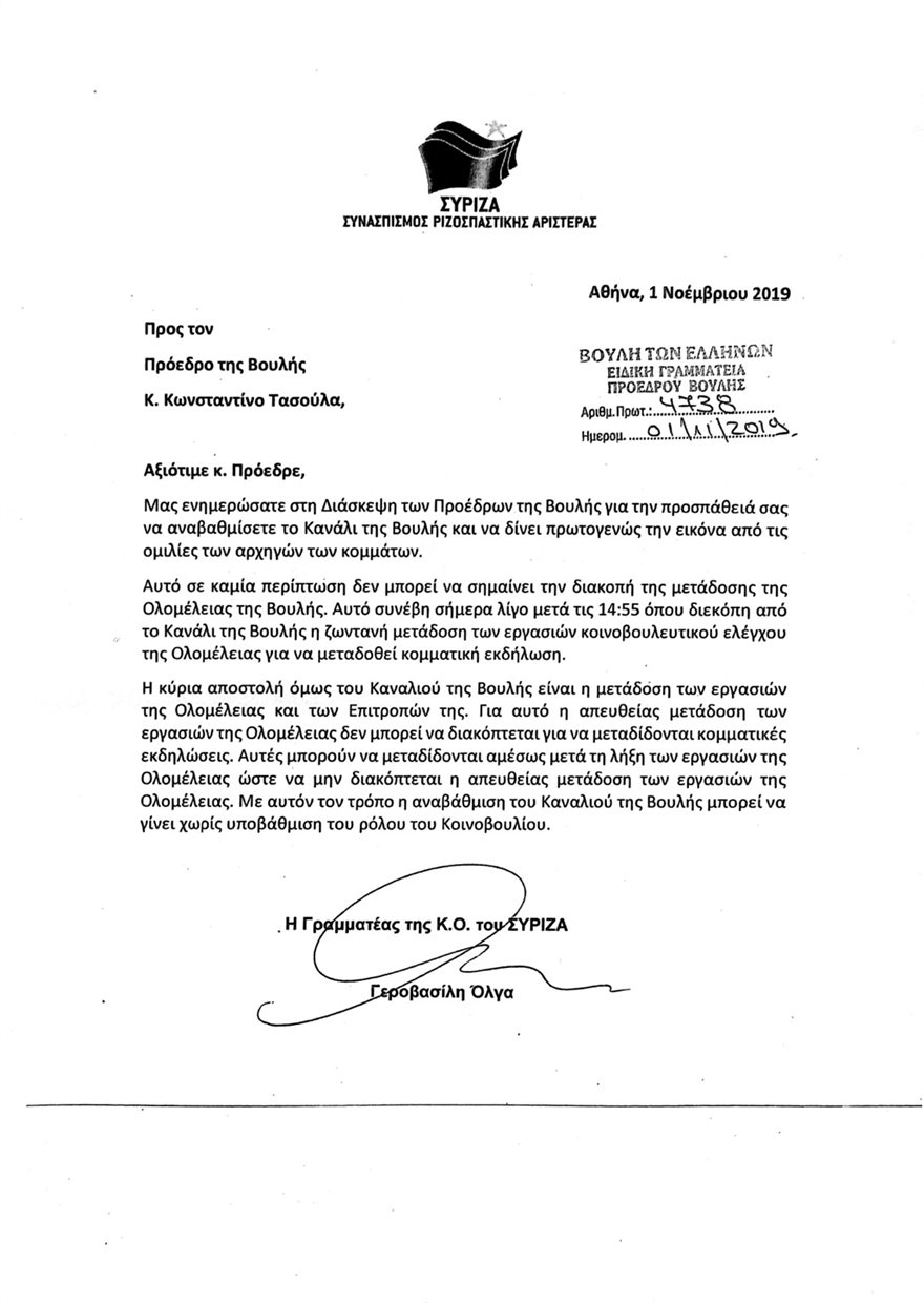 «Μας ενημερώσατε στη Διάσκεψη των Προέδρων της Βουλής για την προσπάθειά σας να αναβαθμίσετε το Κανάλι της Βουλής και να δίνει πρωτογενώς την εικόνα από τις ομιλίες των αρχηγών των κομμάτων. Αυτό σε καμία περίπτωση δεν μπορεί να σημαίνει την διακοπή της μετάδοσης της Ολομέλειας της Βουλής. Αυτό συνέβη σήμερα λίγο μετά τις 14:55 όπου διεκόπη από το Κανάλι της Βουλής η ζωντανή μετάδοση των εργασιών κοινοβουλευτικού ελέγχου της Ολομέλειας για να μεταδοθεί κομματική εκδήλωση» αναφέρει η κυρία Γεροβασίλη.