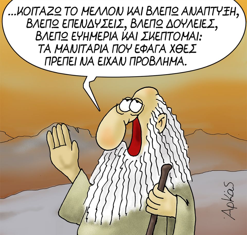 Στο νέο σκίτσο παρουσιάζεται ο… γνωστός σε όλους μας προφήτης, ο οποίος λέει χαρακτηριστικά: «…κοιτάζω το μέλλον και βλέπω ανάπτυξη, βλέπω επενδύσεις, βλέπω δουλείες, βλέπω ευημερία και σκέπτομαι: τα μανιτάρια που έφαγα χθες πρέπει να είχαν πρόβλημα».
