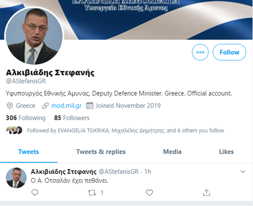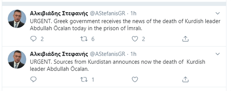 Ο Ιταλός φαρσέρ, ο οποίος λατρεύει να «πειράζει» το Twitter, «πεθαίνοντας» διάφορους γνωστούς, έκανε πάλι το θαύμα του. Συγκεκριμένα, αυτή τη φορά πείραξε τον λογαριασμό του υφυπουργού Άμυνας Αλκιβιάδη Στεφανή και ανακοίνωσε τον θάνατο του Αμπντουλάχ Οτσαλάν.