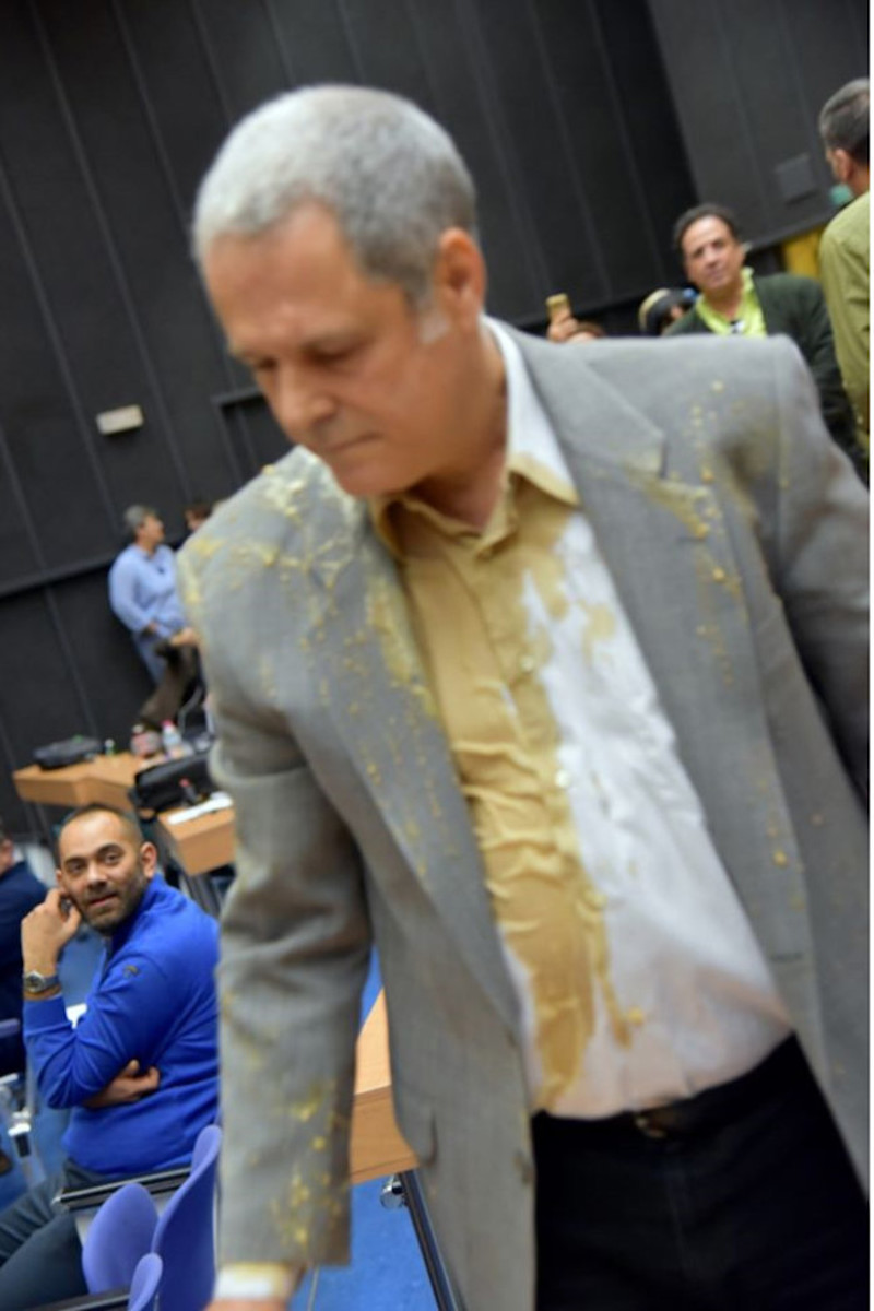 Ο λεκές από καφέ είναι αποτέλεσμα του έντονου καβγά που ξέσπασε μεταξύ του Θάνου Τζήμερου και του επικεφαλής της Λαϊκής Συσπείρωσης Γιάννη Πρωτούλη στη συνεδρίαση του περιφερειακού συμβουλίου. Ο καβγάς ξεκίνησε όταν ο Θάνος Τζήμερος χαρακτήρισε τον Γιάννη Πρωτούλη «σταλινοφασίστα», «άνεργο που υπερασπίζεται τα δικαιώματα των εργαζόμενων» και «εκπρόσωπο κόμματος που θέλει να φέρει στην Ελλάδα τη δικτατορία και τον εμφύλιο».