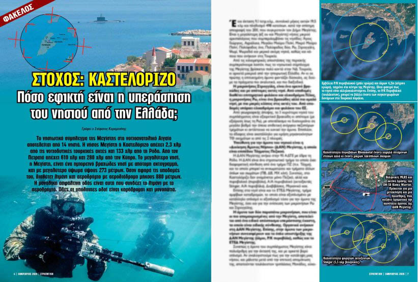 Ακόμα στη νέα ΣΤΡΑΤΗΓΙΚΗ: Μετά την ανακήρυξη της τουρκικής ΑΟΖ και την συμφωνία Τουρκίας-Λιβύης που «καταπίνει» -μεταξύ άλλων- το νησιωτικό σύμπλεγμα της Μεγίστης (Καστελόριζου) και δείχνει την τουρκική πρόθεση ακόμα και στρατιωτικής κατοχής του, το ερώτημα που ανακύπτει είναι: «Μπορεί η Ελλάδα να υπερασπίσει αποτελεσματικά τα νησιά και τις βραχονησίδες του συμπλέγματος;».