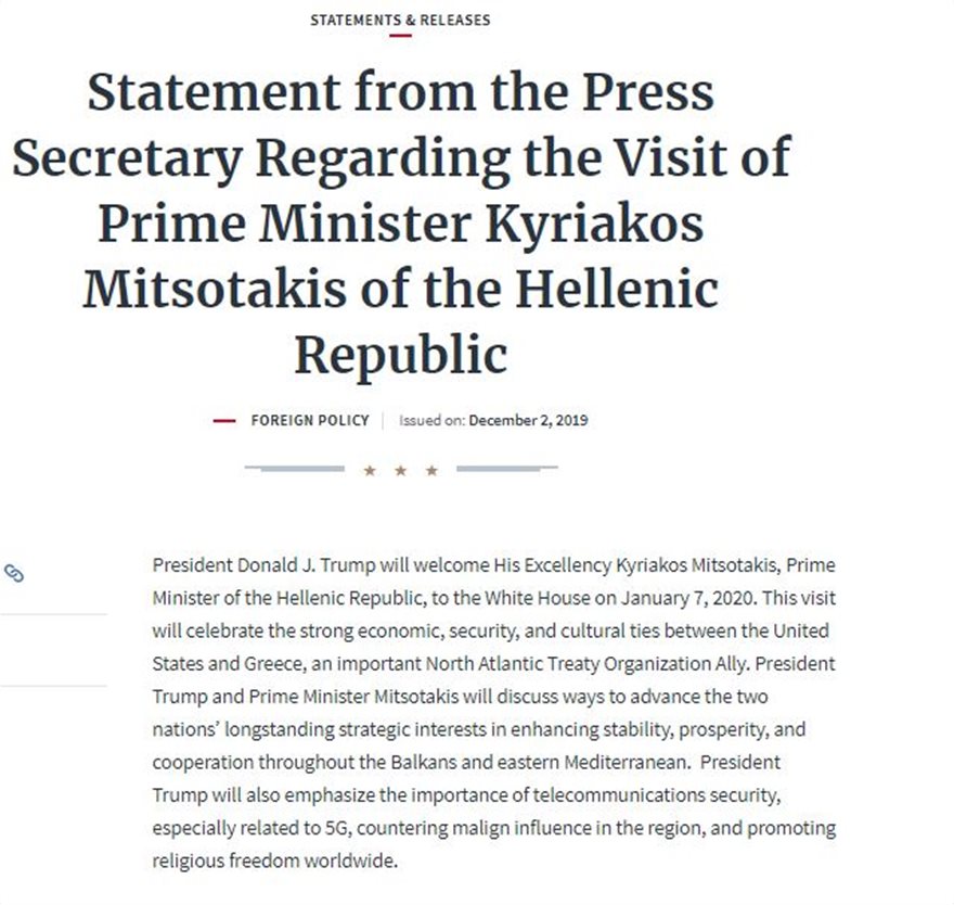 Ο Λευκός Οίκος ανακοίνωσε επίσημα πριν από λίγο την συνάντηση του Κυριάκου Μητσοτάκη με τον Ντόναλντ Τραμπ η οποία θα πραγματοποιηθεί στις 7 Ιανουάρίου στην αμερικανική πρωτεύουσα.