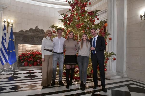 Συγκεκριμένα, ο πρωθυπουργός Κυριάκος Μητσοτάκης πόζαρε μαζί με τη σύζυγό του, Μαρέβα και τα τρία τους παιδιά, μπροστά από το χριστουγεννιάτικο δέντρο στο Μέγαρο Μαξίμου.