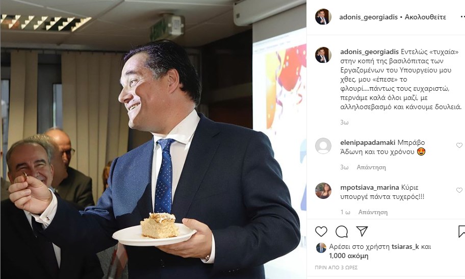 “Εντελώς «τυχαία» στην κοπή της βασιλόπιτας των Εργαζομένων του Υπουργείου μου χθες, μου «έπεσε» το φλουρί….πάντως τους ευχαριστώ, περνάμε καλά όλοι μαζί, με αλληλοσεβασμό και κάνουμε δουλειά” έγραψε σε ανάρτησή του στο instagram, ο υπουργός Ανάπτυξης και Επενδύσεων, Άδωνις Γεωργιάδης.