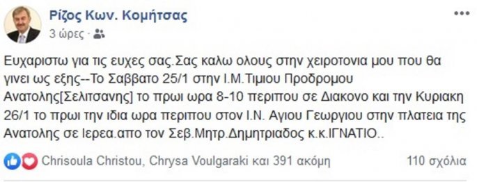 Η χειροτονία θα τελεστεί στον Ιερό Ναό του Αγίου Γεωργίου, στην Ανατολή Αγιάς, τόπο καταγωγής του πρώην δημάρχου.Εκεί, ο κ. Κομήτσας θα γίνει και εφημέριος στο ναό. “Ήρθε ο καιρός να ησυχάσω…” ήταν το σχόλιό του, όταν ρωτήθηκε από φίλους γι’ αυτή του την απόφαση, η οποία όμως για όσους γνωρίζουν καλά τον άνθρωπο Ρίζο και την ιδιοσυγκρασία του, δεν προκάλεσε καμία εντύπωση.