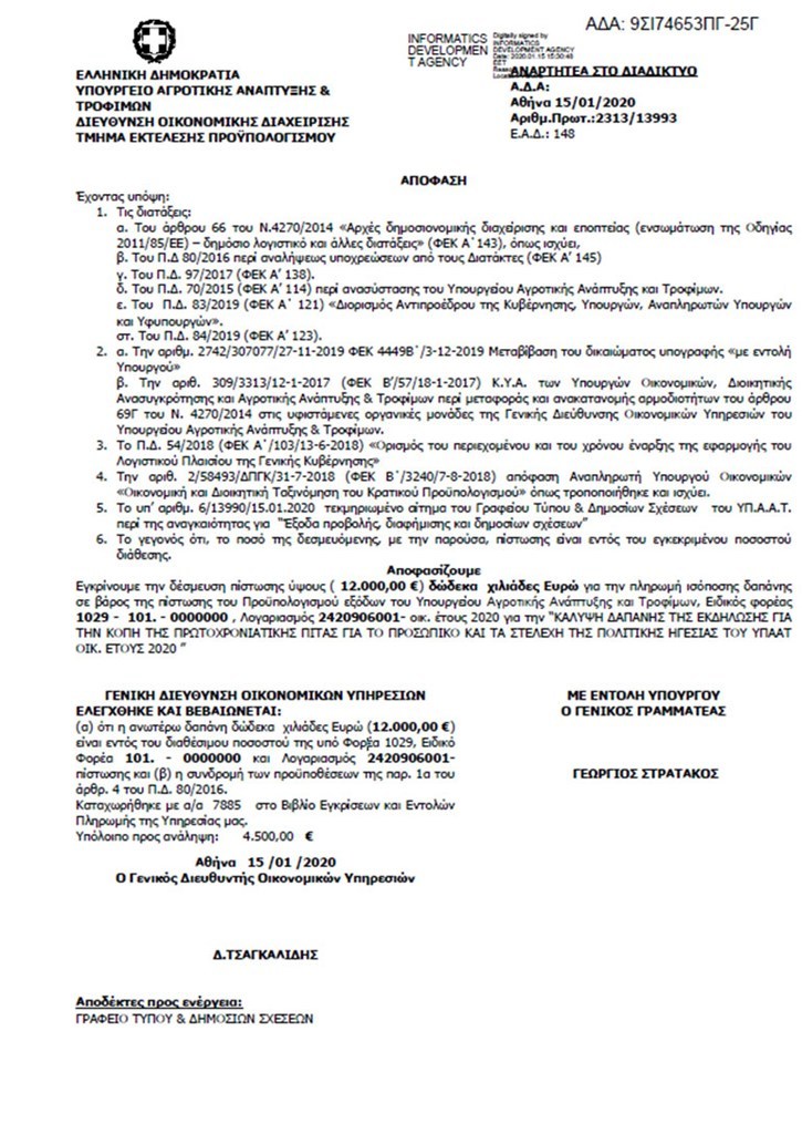 Σύμφωνα με απόφαση που αναρτήθηκε στην Διαύγεια, το υπουργείο ενέκρινε την δέσμευση πίστωσης ύψους 12.000 ευρώ για την «κάλυψη της δαπάνης της εκδήλωσης για την κοπή της πρωτοχρονιάτικης πίτας για το προσωπικό και τα στελέχη της πολιτικής ηγεσίας του ΥΠΑΑΤ οικ. έτους 2020». Αυτή η κίνηση εξόργισε όπως φαίνεται την πρώην υφυπουργό Αγροτικής Ανάπτυξης και Τροφίμων, Ολυμπία Τελιγιορίδου η οποία έγραψε στον προσωπικό της λογαριασμό στο Facebook ότι «πέρσι η βασιλόπιτα κόστισε μόλις 30 ευρώ».