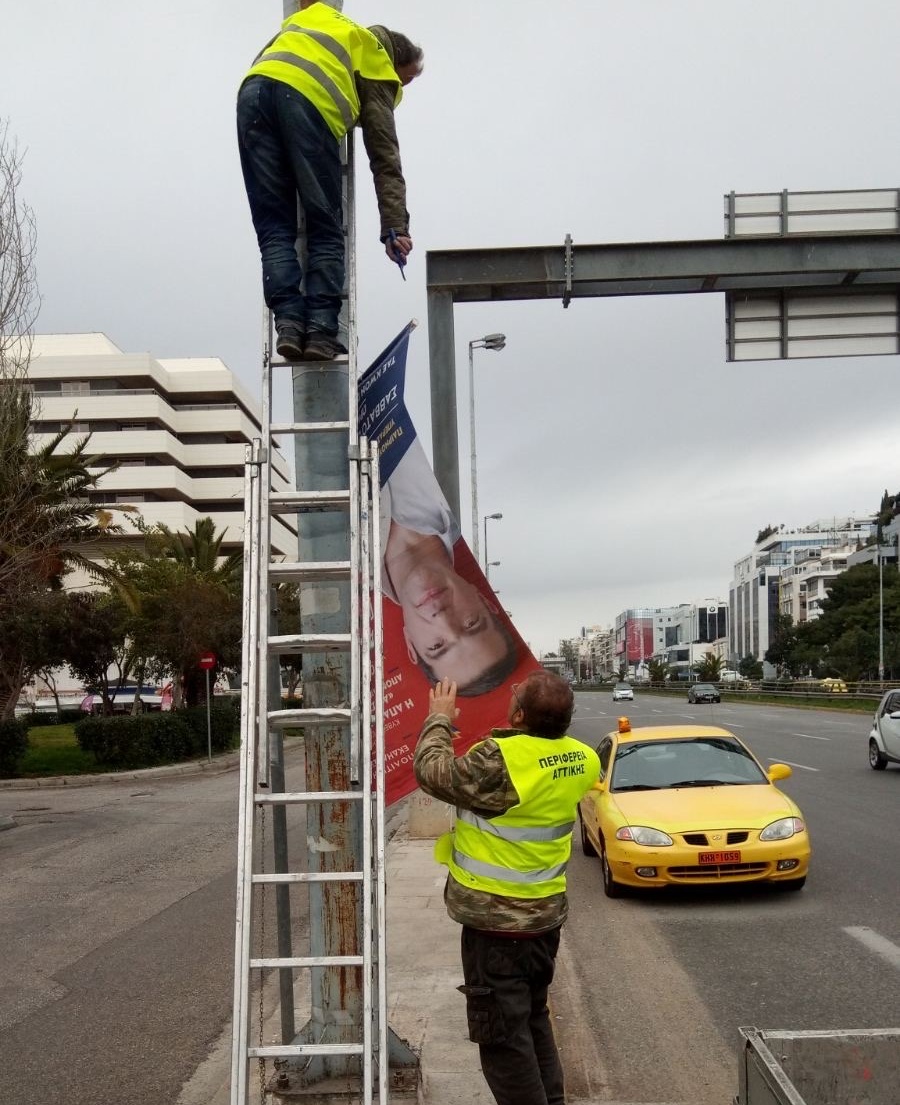 Εργαζόμενοι και συνεργεία της Περιφέρειας Αττικής απομάκρυναν αφίσες που είχαν αναρτηθεί στην κεντρική νησίδα κατά μήκος όλης της Λεωφόρου Αλεξάνδρας, στη Συγγρού από το ύψος της οδού Λαγουμιτζή μέχρι το Ωνάσειο και στα δύο ρεύματα και στην παραλιακή από τη συμβολή της με τη Συγγρού μέχρι το Πάρκο Φλοίσβου, επίσης και στα δύο ρεύματα.