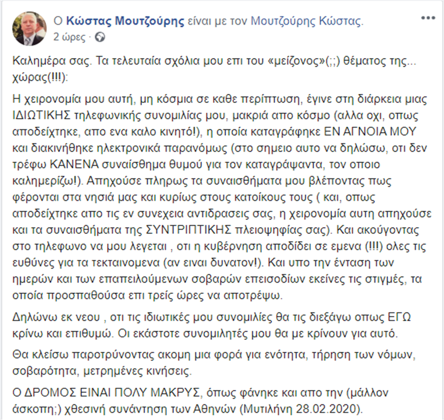 «Απηχούσε πλήρως τα συναισθήματα μου βλέποντας πως φέρονται στα νησιά μας και κυρίως στους κατοίκους τους ( και, οπως αποδείχτηκε από τις εν συνέχεια αντιδράσεις σας, η χειρονομία αυτή απηχούσε και τα συναισθήματα της ΣΥΝΤΡΙΠΤΙΚΗΣ πλειοψηφίας σας)», γράφει ο Κώστας Μουτζούρης σε ανάρτησή του στο Facebook.