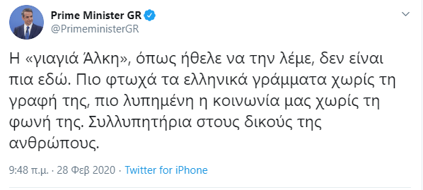 Την Άλκη Ζέη αποχαιρετά, με τον δικό του τρόπο, ο πρωθυπουργός Κυριάκος Μητσοτάκης.