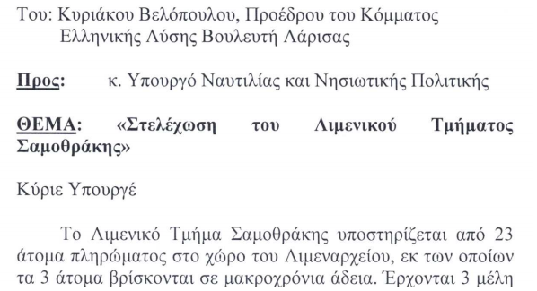Ερώτηση στον αρμόδιο υπουργό Ναυτιλίας και Νησιωτικής Πολιτικής Γιάννη Πλακιωτάκη για τις ελλείψεις προσωπικού στο Λιμενικό Τμήμα Σαμοθράκης, κατέθεσε ο Πρόεδρος του κόμματος “ΕΛΛΗΝΙΚΗ ΛΥΣΗ” Κυριάκος Βελόπουλος.