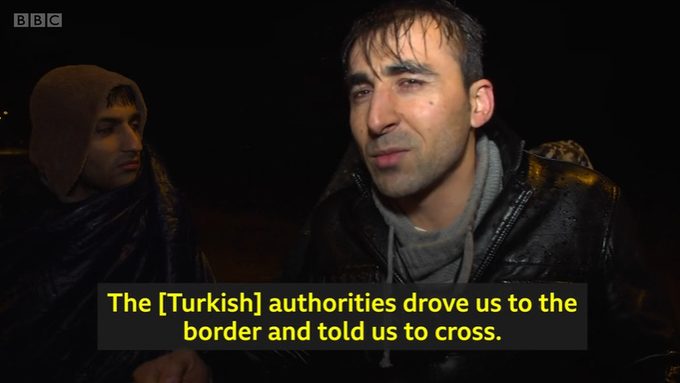 Η κάμερα του BBC και ο δημοσιογράφος Τζόναθ Φίσερ συνάντησε παράνομους μετανάστες στον Έβρο, συνομίλησε μαζί τους και κατέγραψε την κατάσταση που επικρατεί τις τελευταίες ημέρες στα ελληνοτουρκικά σύνορα. «Ήρθαμε στα σύνορα με το λεωφορείο. Οι τουρκικές Αρχές μας έφεραν εδώ και μας είπαν να περάσουμε. Κόψαμε το αγκαθωτό συρματόπλεγμα και περάσαμε» λέει χαρακτηριστικά ένας εξ’ αυτών.