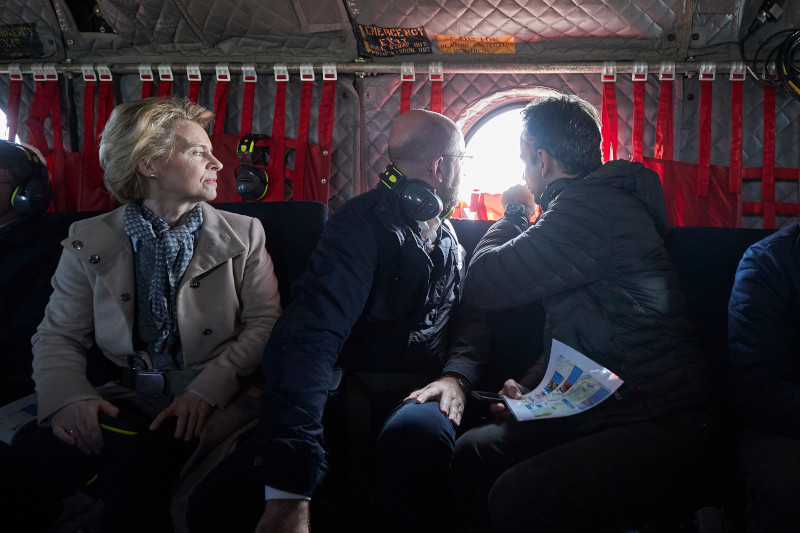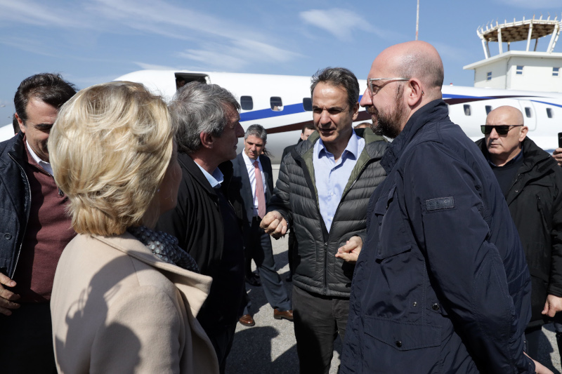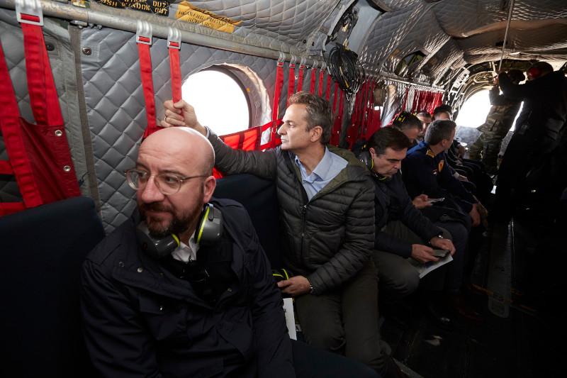 Νωρίτερα το μεσημέρι ο Έλληνας πρωθυπουργός υποδέχθηκε στον Εβρο τον πρόεδρο του Ευρωπαϊκού Συμβουλίου Σαρλ Μισέλ, την πρόεδρο της Ευρωπαϊκής Επιτροπής Ούρσουλα φον ντερ Λάιεν και τον πρόεδρο του Ευρωπαϊκού Κοινοβουλίου Νταβίντ Σασόλι. Ολοι μαζί πετώντας με ελικόπτερο Σινούκ επιθεώρησαν την κατάσταση στα ελληνοτουρκικά σύνορα και είδαν τι επικρατεί στην περιοχή.