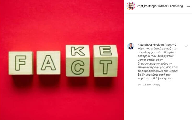 «Αγαπητέ κύριε Κουτσόπουλε σας ζητώ συγνώμη για το λανθασμένο ρεπορτάζ των συνεργατών μου,οι οποίοι είχαν δημοσιογραφικό χρέος να επικοινωνήσουν μαζί σας πριν το δημοσιεύσουν. Η εφημερίδα θα δημοσιεύσει αυτή την Κυριακή τη διάψευση σας» ανέφερε ο Νίκος Χατζηνικολάου.