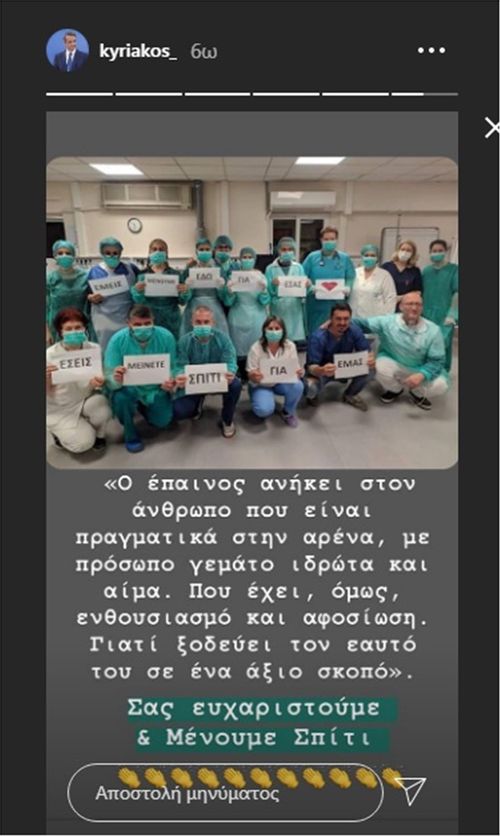«Ο έπαινος ανήκει στον άνθρωπο που είναι πραγματικά στην αρένα, με πρόσωπο γεμάτο ιδρώτα και αίμα. Που έχει, όμως, ενθουσιασμό και αφοσίωση. Γιατί ξοδεύει τον εαυτό του σε ένα άξιο σκοπό. Σας ευχαριστούμε και Μένουμε Σπίτι» έγραψε στο Instagram ο κ. Μητσοτάκης.