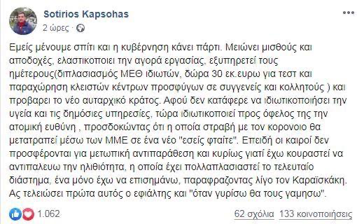 «Εμείς μένουμε σπίτι και η κυβέρνηση κάνει πάρτι. Μειώνει μισθούς και αποδοχές, ελαστικοποιεί την αγορά εργασίας, εξυπηρετεί τους ημετέρους (διπλασιασμός ΜΕΘ ιδιωτών, δώρα 30 εκ ευρώ για τεστ και παραχώρηση κλειστών κέντρων προσφύγων σε συγγενείς και κολλητούς) και προβάρει το νέο αυταρχικό κράτος. Αφού δεν κατάφερε να ιδιωτικοποιήσει προς όφελός της την ατομική ευθύνη, προσδοκώντας ότι η όποια στραβή με τον κορονοϊό θα μετατραπεί μέσω των ΜΜΕ σε ένα νέο «εσείς φταίτε». Επειδή οι καιροί δεν προσφέρονται για μετωπική αντιπαράθεση και κυρίως γιατί έχω κουραστεί να αντιπαλεύω την ηλιθιότητα, η οποία έχει πολλαπλασιαστεί το τελευταίο διάστημα, ένα μόνο έχω να επισημάνω, παραφράζοντας λίγο τον Καραϊσκάκη. Ας τελειώσει πρώτα αυτός ο εφιάλτης και «όταν γυρίσω θα τους γαμ…»».