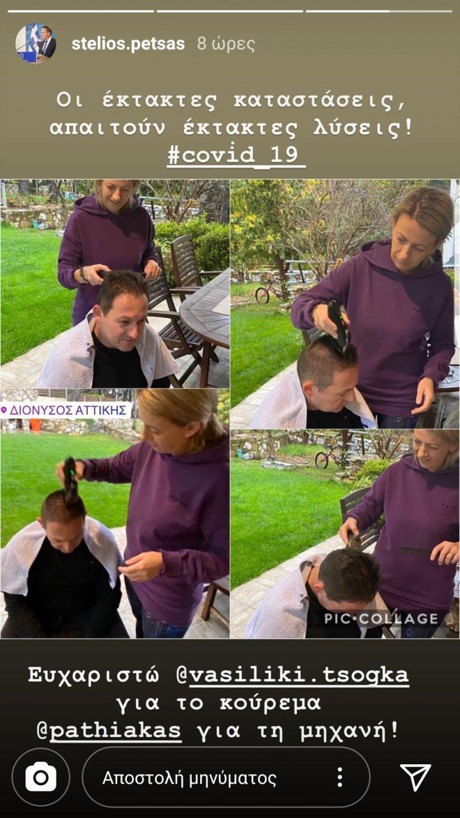 Ο κυβερνητικός εκπρόσωπος Στέλιος Πέτσας αποφάσισε εφόσον τα κομμωτήρια είναι κλειστά, να εμπιστευτεί τα μαλλιά του στα χέρια της συζύγου του, Βασιλικής Τσόγκα, η οποία τον κούρεψε στην αυλή του σπιτιού τους.