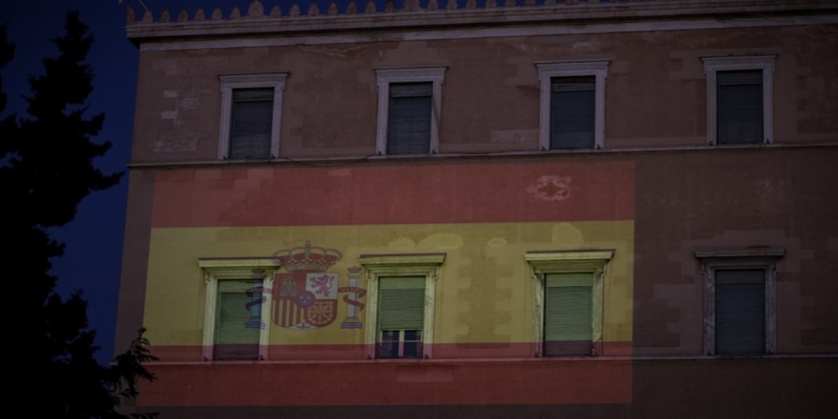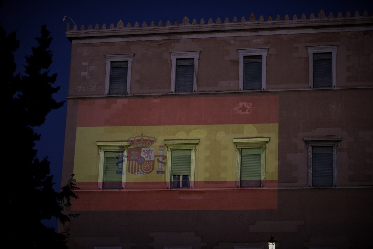 Η Βουλή των Ελλήνων φωταγωγείται με τα χρώματα της Ισπανικής σημαίας ως έκφραση αλληλεγγύης προς τον λαό της Ισπανίας.