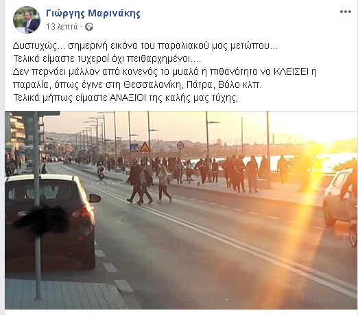 Ενοχλημένος εμφανίστηκε ο Δήμαρχος Ρεθύμνου, Γιώργος Μαρινάκης, από την εικόνα στον παραλιακό δρόμο της πόλης το Σάββατο εν μέσω των μέτρων για τον περιορισμό της εξάπλωσης του κορονοϊού.