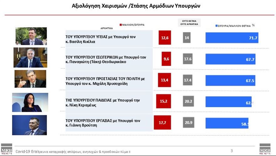 Από τους υπουργούς της κυβέρνησης πρώτο στα θετικά σχόλια είναι ο Βασίλης Κικίλιας με ποσοστό 71,7% , ακολουθεί ο Τάκης Θεοδωρικάκος με 67,7%, ο Μιχάλης Χρυσοχοΐδης με 67,5%, η Νίκης Κεραμέως με 62,4 και Βρούτσης. Την πεντάδα συμπληρώνει ο Γιάννης Βρούτσης με 58,1%.
