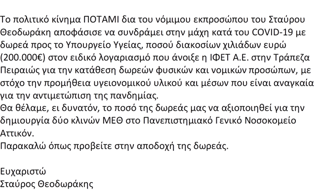 Υπενθυμίζεται πως η δέσμευση του Σταύρου Θεοδωράκη ήταν ότι τα λεφτά που θα παίρνει το Ποτάμι μέχρι τις ευρωεκλογές του 2024 – μέχρι τότε δικαιούται χρηματοδότηση, καθώς είχε λάβει ποσοστό 1,5% το 2019 – θα ενισχύουν επιμορφωτικούς σκοπούς καθόσον η πολιτική του λειτουργία έχει ανασταλεί, αλλά τώρα όλα αλλάζουν και προέχει η ενίσχυση του δημόσιου συστήματος υγείας.