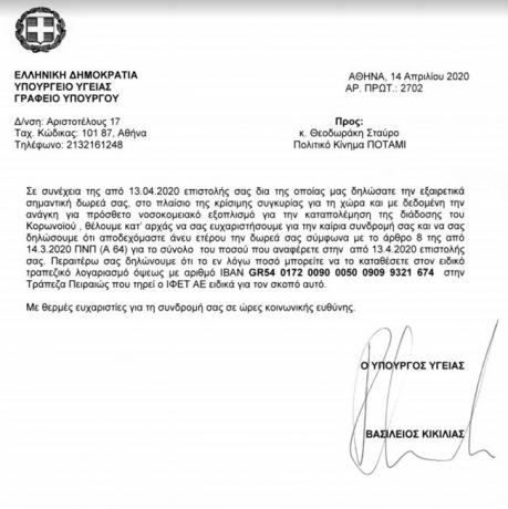 Ο Υπουργός Υγείας Βασίλης Κικίλιας ευχαρίστησε με ανακοίνωση «Το Ποτάμι» και τον κ. Σταύρο Θεοδωράκη για τη σημαντική συμβολή τους στην ενίσχυση του Εθνικού Συστήματος Υγείας, για την αντιμετώπιση της μεγάλης κρίσης Δημόσιας Υγείας που βιώνουμε στη χώρα.