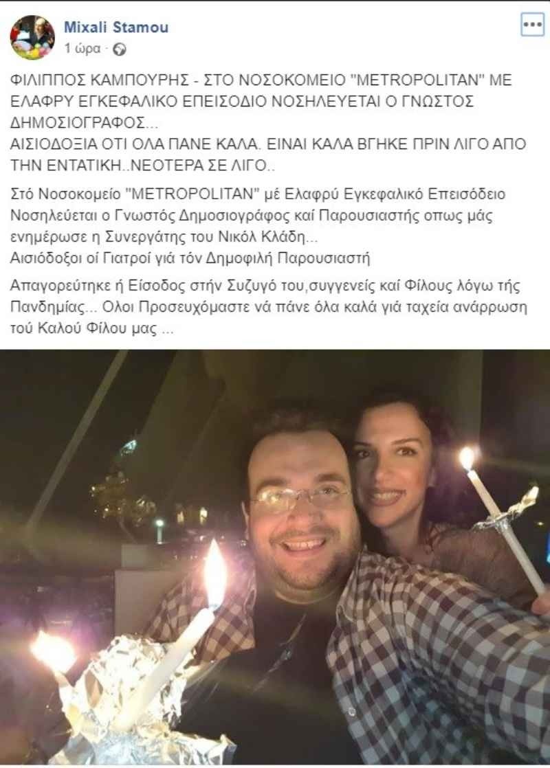 Την είδηση γνωστοποίησε ο διευθυντής του αρτ fm στους 90,6 Μιχάλης Στάμου με μια ανάρτηση στο προφίλ του στο facebook, γράφοντας χαρακτηριστικά, “ΦΙΛΙΠΠΟΣ ΚΑΜΠΟΥΡΗΣ – ΣΤΟ ΝΟΣΟΚΟΜΕΙΟ ”METROPOLITAN” ΜΕ EΛΑΦΡΥ ΕΓΚΕΦΑΛΙΚΟ ΕΠΕΙΣΟΔΙΟ ΝΟΣΗΛΕΥEΤΑΙ Ο ΓΝΩΣΤΟΣ ΔΗΜΟΣΙΟΓΡΑΦΟΣ… ΑΙΣΙΟΔΟΞΙΑ ΟΤΙ ΟΛΑ ΠΑΝΕ ΚΑΛΑ. ΕΙΝΑΙ ΚΑΛΑ ΒΓΗΚΕ ΠΡΙΝ ΛΙΓΟ ΑΠΟ ΤΗΝ ΕΝΤΑΤΙΚΗ..ΝΕΟΤΕΡΑ ΣΕ ΛΙΓΟ.. Στην Εντατική τού Νοσοκομείου ”METROPOLITAN” με Εγκεφαλικό Επεισόδιο Νοσηλεύεται ο Γνωστός Δημοσιογράφος και Παρουσιαστής όπως μάς ενημέρωσε η Συνεργάτης του Νικόλ Κλάδη…
