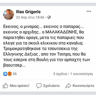 Σφοδρή επίθεση με «βαριές» κουβέντες εξαπέλυσε ο υποψήφιος βουλευτής του ΣΥΡΙΖΑ, Ηλίας Γρηγόρης προς την κυβέρνηση, τον Κυριάκο Μητσοτάκη, αλλά και τους Σωτήρη Τσιόδρα και Νίκο Χαρδαλιά