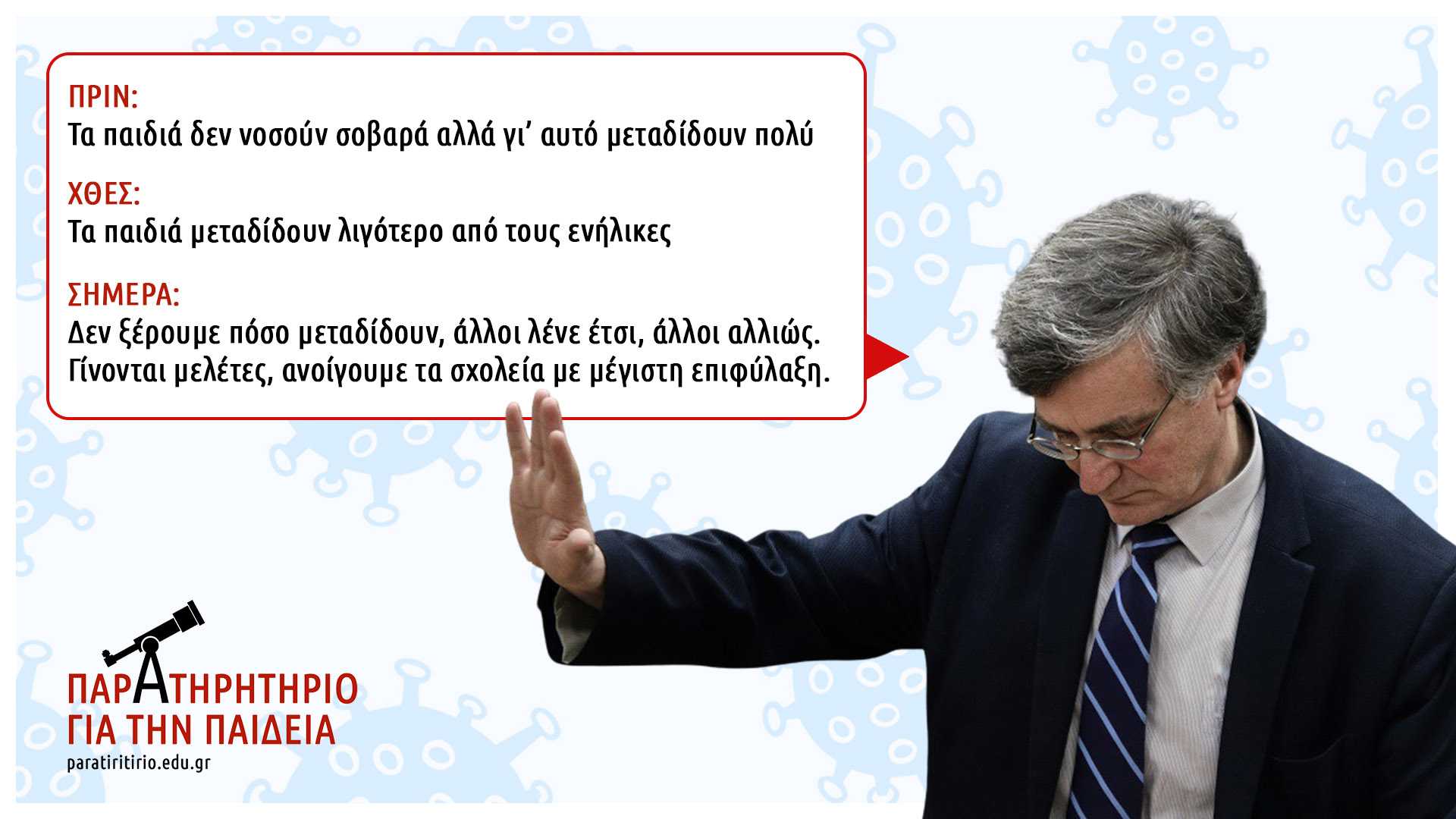 «Χθες διατυπώσαμε με επιχειρήματα την αντίρρησή μας στο άνοιγμα των σχολείων που αποφάσισε η κυβέρνηση, πλην βεβαίως, της Γ’ Λυκείου. Σήμερα ο κ. Τσιόδρας έκανε λόγο για μέγιστη επιφύλαξη αναφορικά με την επαναλειτουργία των σχολείων. «Μέγιστη επιφύλαξη» και σύμφωνη γνώμη να ανοίξουν τα σχολεία είναι μέγιστη αντίφαση.