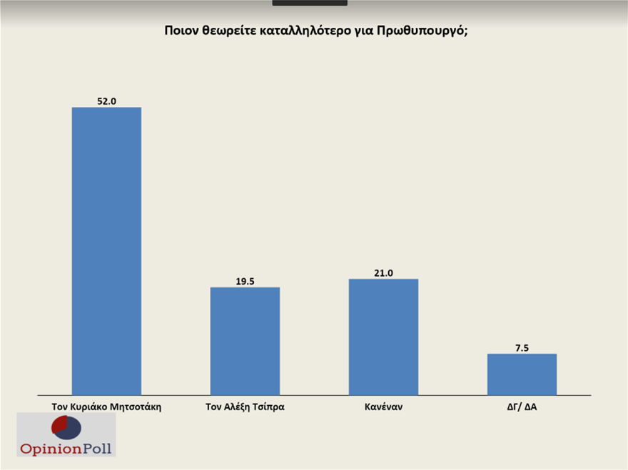 Η κυριαρχία αυτή εκφράζεται και στην ερώτηση για την καταλληλότητα ως Πρωθυπουργός συγκεντρώνοντας το 52% των προτιμήσεων, με τον Αλέξη Τσίπρα να περιορίζεται στο 19.5%.