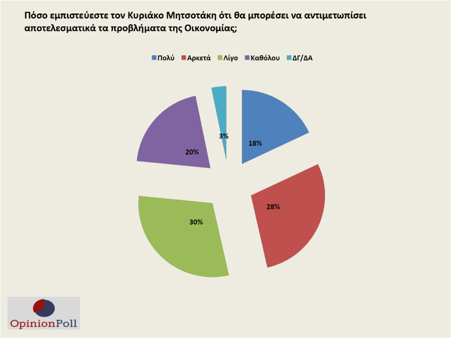 Όσο για την επόμενη ημέρα, την αντιμετώπιση δηλαδή της οικονομικής κρίσης, οι πολίτες εκφράζουν απαισιοδοξία. Στη ερώτηση το 47% δηλώνει πολύ και αρκετή εμπιστοσύνη στον Κυριάκο Μητσοτάκη έναντι 50% που δηλώνει λίγο και καθόλου εμπιστοσύνη. Αυτό το εύρημα χτυπάει καμπανάκι για την ετοιμότητα της Κυβέρνησης στο επόμενο διάστημα.