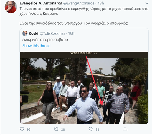 Ο Βαγγέλης Αντώναρος είδε μια φωτογραφία από την επίσκεψη Αδωνι Γεωργιάδη στις πλαζ, για να ελέγξει αν τηρούνται τα μέτρα κοινωνικής απόστασης, και μπέρδεψε τον δημοσιογράφο Γιώργο Σαραντάκο του Σταρ με άνδρα της Ασφάλειας. Αλλά ο Αντώναρος δεν έμεινε μόνο σ’ αυτό καθώς έσπευσε να βγάλει… γνωμάτευση και για το μικρόφωνο που κρατούσε ο δημοσιογράφος το οποίο ήταν κάτι ανάμεσα σε γκλοπ και καδρόνι.