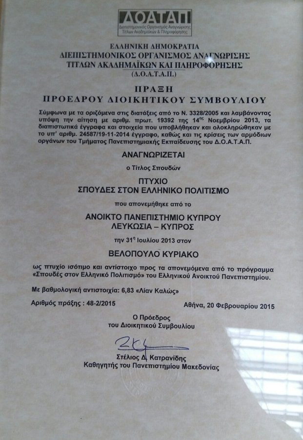 Σύμφωνα με το έγγραφο του ΔΟΑΤΑΠ ο Κυριάκος Βελόπουλος είναι πτυχιούχος του Ανοικτού Πανεπιστημίου Κύπρου στην επιστήμη του Ελληνικού Πολιτισμού, πτυχίο ισότιμο με το ελληνικό Ανοικτό Πανεπιστήμιο και αντίστοιχο με αυτό που έχουν στην ίδια επιστήμη πολλοί βουλευτές της ΝΔ (Θ.Ρουσσόπουλος, Γ.Ανδριανός κλπ).