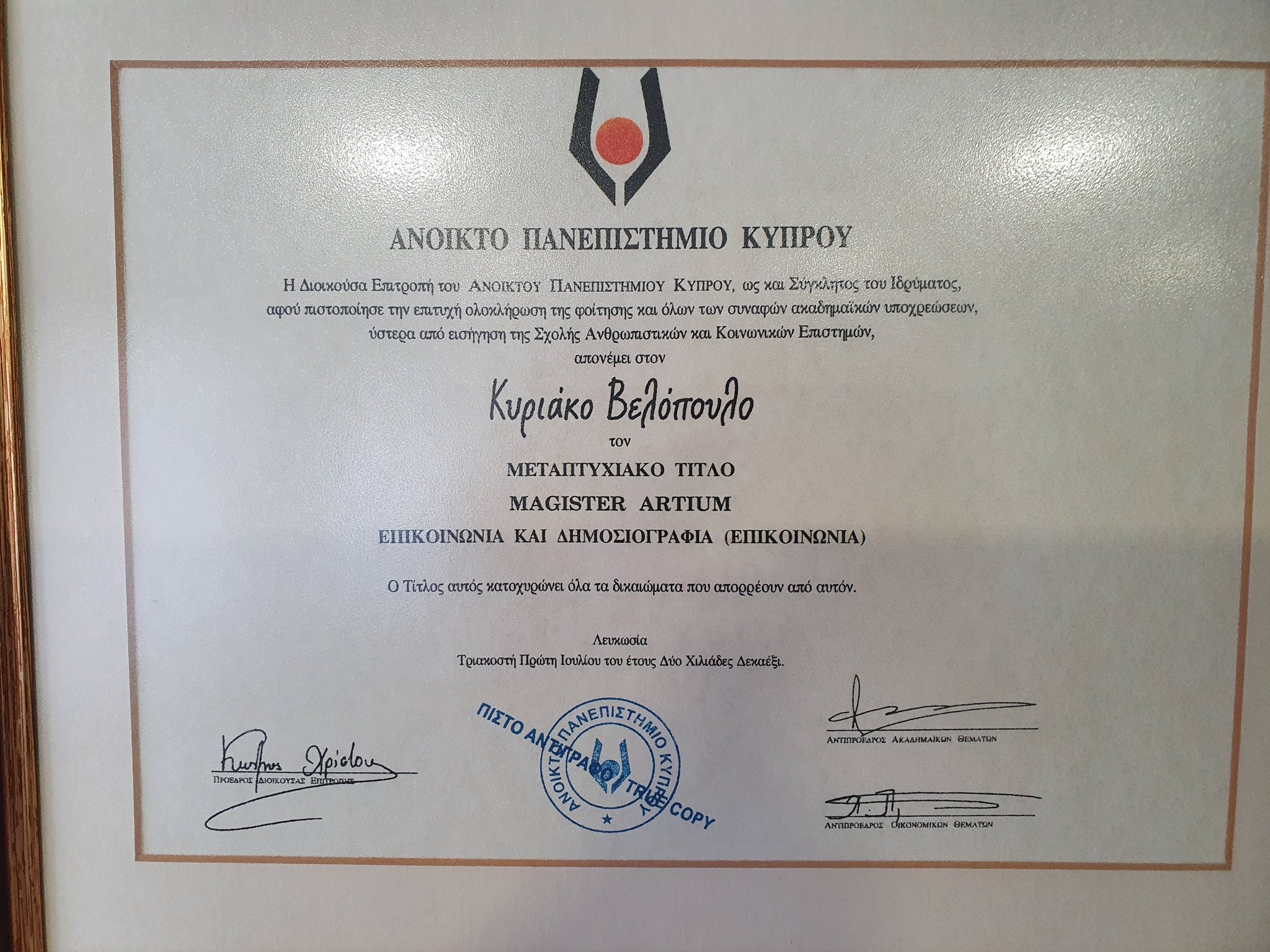 Κατέρρευσε η συκοφαντία κατά του προέδρου της Ελληνικής Λύσης Κυριάκου Βελόπουλου καθώς με δήλωσή του ο Πρύτανης του Ανοικτού Πανεπιστημίου Κύπρου Σωκράτης Κάτσικας επιβεβαίωσε ότι ο Κ.Βελόπουλος φοίτησε και έλαβε πτυχίο από το συγκεκριμένο πανεπιστημιακό ίδρυμα.