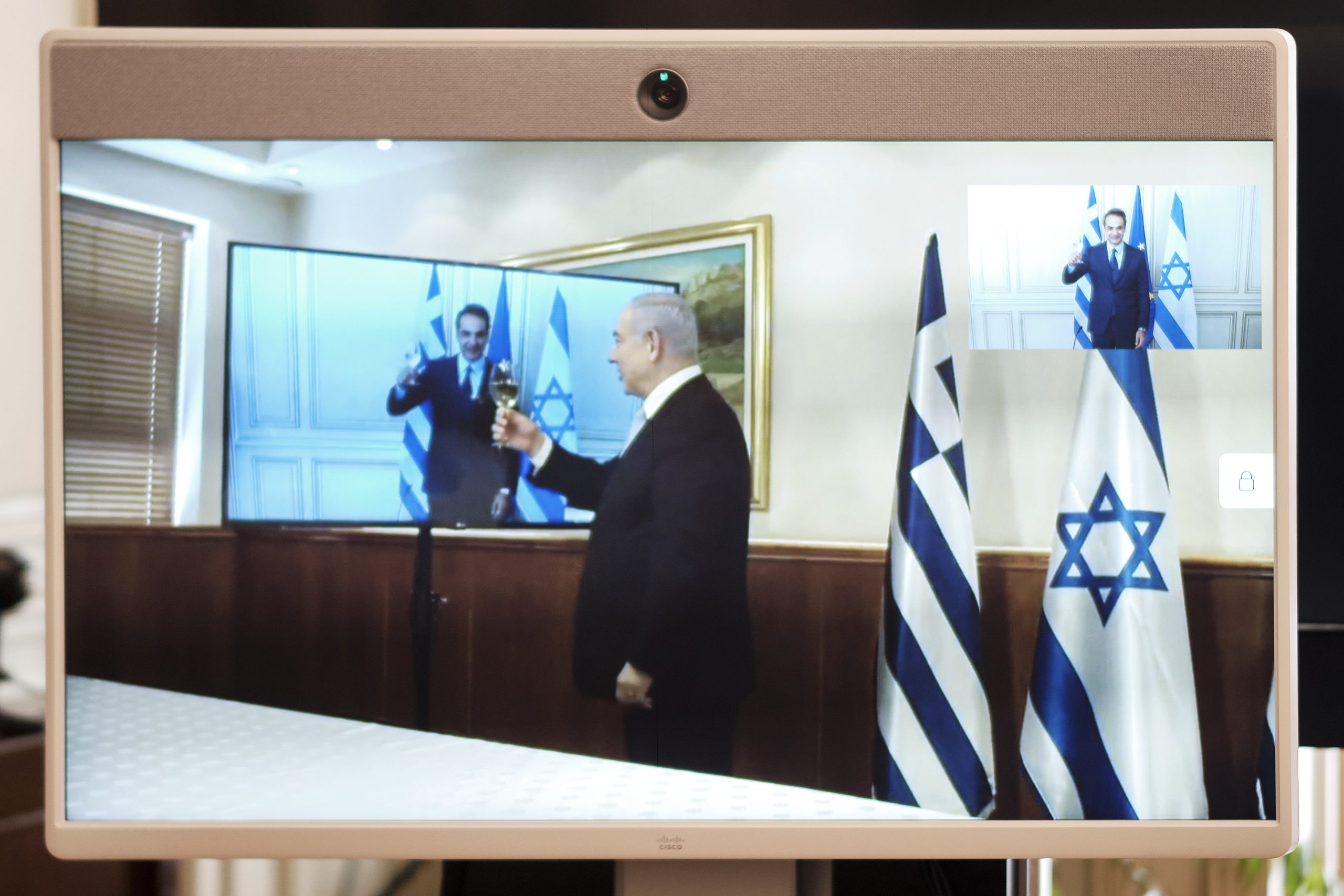 Μάλιστα, Κυριάκος Μητσοτάκης και Μπέντζαμιν Νετανιάχου γιόρτασαν την περίσταση πίνοντας ένα ποτήρι λευκό κρασί. Σημειώνεται ότι σε μια στιγμής της τηλεδιάσκεψης ο κ. Νετανιάχου πλησίασε την κάμερα προκειμένου να «τσουγκρίσει» το ποτήρι του με αυτό του Ελληνα πρωθυπουργού.
