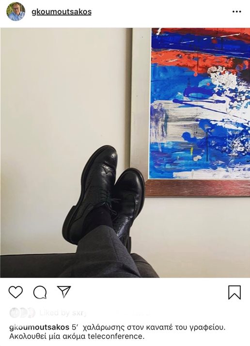 Ο Γιώργος Κουμουτσάκος ανέβασε μια φωτογραφία όπου «απαθανατίζει» τα παπούτσια του να βρίσκονται πάνω στον καναπέ του γραφείου του ενώ εξηγεί στη λεζάντα ότι χρειάστηκε πέντε λεπτά ξεκούρασης ανάμεσα στις τηλεδιασκέψεις.