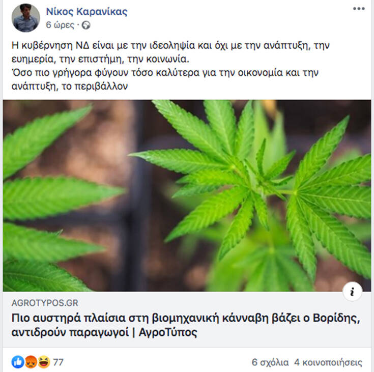 Το στέλεχος του κόμματος της αξιωματικής αντιπολίτευσης δεν συμφωνεί με τους χειρισμούς του υπουργού Αγροτικής Ανάπτυξης Μάκη Βορίδη σε σχέση με τη βιομηχανική κάνναβη και φροντίζει να κοινοποιήσει την άποψή του δημοσίως αναφέροντας: «Η κυβέρνηση ΝΔ είναι με την ιδεοληψία και όχι με την ανάπτυξη, την ευημερία, την επιστήμη, την κοινωνία. Όσο πιο γρήγορα φύγουν τόσο καλύτερα για την οικονομία και την ανάπτυξη, το περιβάλλον».