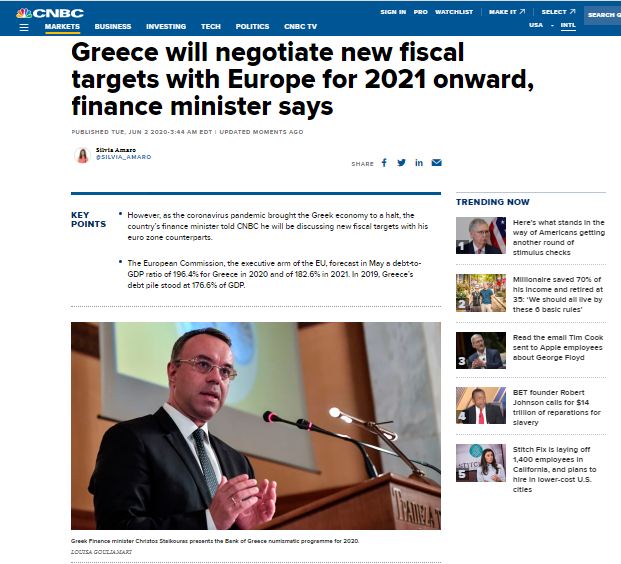 Ο Υπουργός Οικονομικών, Χρήστος Σταϊκούρας, κατά τη διάρκεια συνέντευξής του στο CNBC, ανέφερε πως η ελληνική κυβέρνηση έχει στόχο να διαπραγματευτεί νέους δημοσιονομικούς στόχους με τους Ευρωπαίους εταίρους.