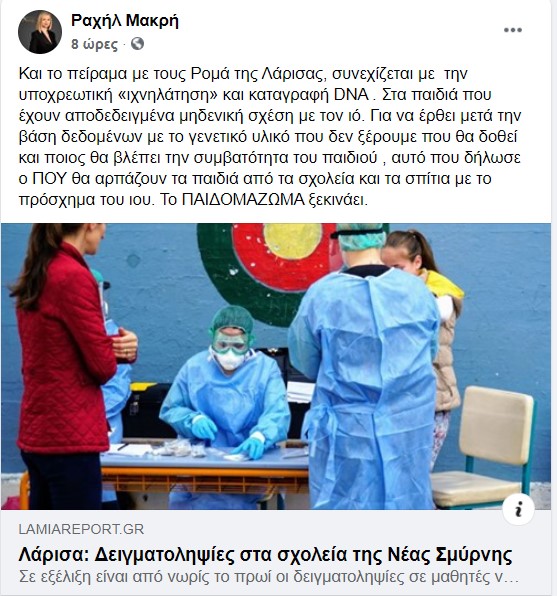 Ανάρτηση για την δειγματοληψία παιδιών στη Λάρισα έκανε η Ραχήλ Μακρή κάνοντας λόγο για παιδομάζωμα.
