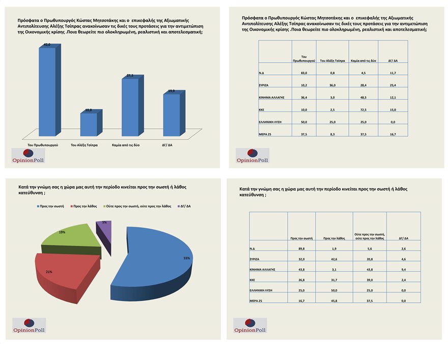 Σχετικά όμως με τις προτάσεις για την αντιμετώπισης της οικονομικής κρίσης, αυτή της ΝΔ λαμβάνει 42%, ενώ εκείνη του ΣΥΡΙΖΑ μόλις 10,8%.