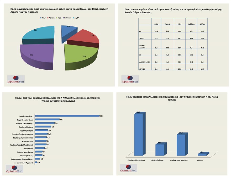 Ο Κώστας Μπακογιάννης έχει θετικές κρίσεις σε ποσοστό 545 και αρνητικές σε ποσοστό 38%, ενώ ο Γιώργος Πατούλης έχει θετικές γνώμες 29% και αρνητικές 45%.
