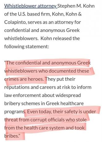 Μάλιστα στο κείμενο του δικηγόρου των προστατευόμενων μαρτύρων αναφέρεται ρητά πως οι προστατευόμενοι μάρτυρες «κινδυνεύουν σήμερα από διεφθαρμένους αξιωματούχους που χρηματίστηκαν και έκλεψαν από το δημόσιο σύστημα υγείας».